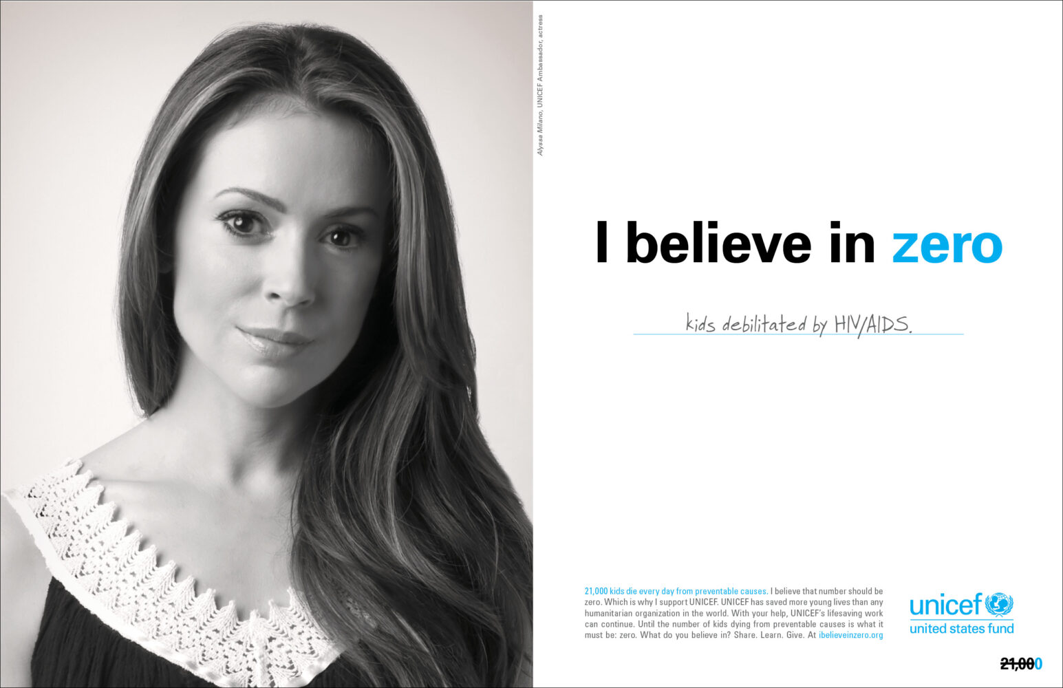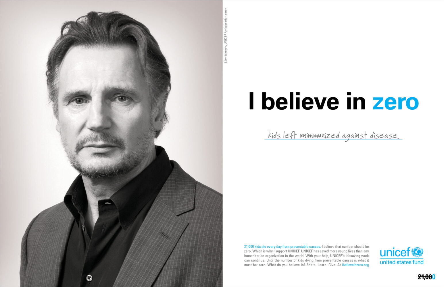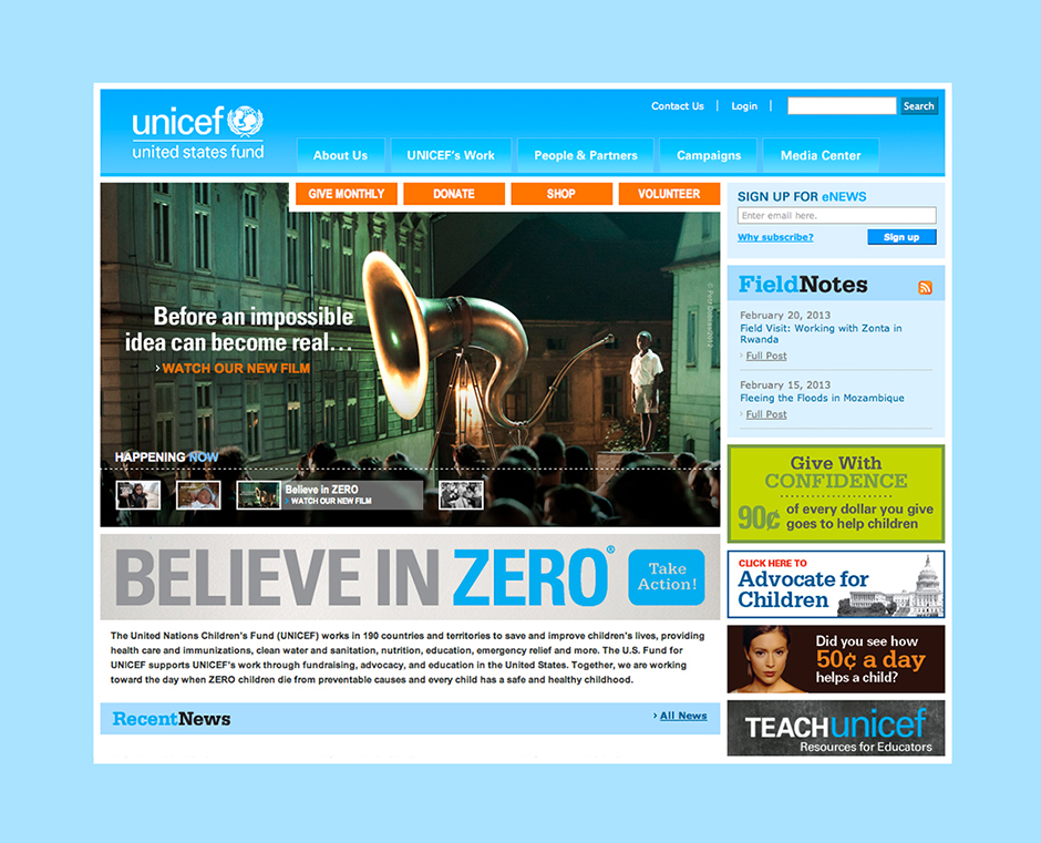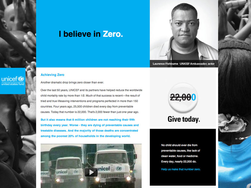 The insight: No child should ever die from a cause the world has the power to prevent. The action: Tap the power of the human spirit and build a community of believers. Enter “Believe in Zero,” the campaign my team and I created for UNICEF. The result: According to the fund’s then-CMO, our platform “revolutionized UNICEF’s approach to fundraising and advocacy.” For its effectiveness, the campaign was heralded by The Chronicle of Philanthropy, as well as the book Breakthrough Nonprofit Branding: Seven Principles to Power Extraordinary Results (AFP/Wiley)