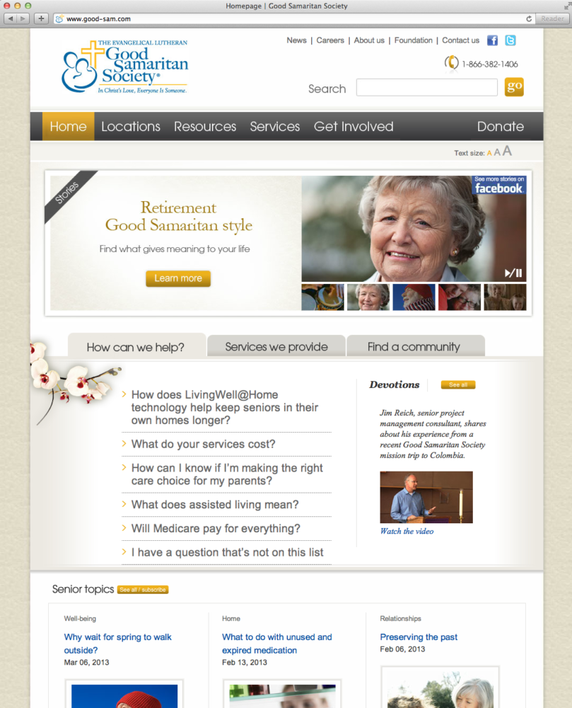 As the largest nonprofit provider of elderly care in the United States, the Good Samaritan Society (GSS) has an impressive reputation for offering not only an exceptional service, but also an exceptional spiritual dimension. GSS needed help in developing a unifying brand message, and we’re integrating that message into all of their product-level communications.