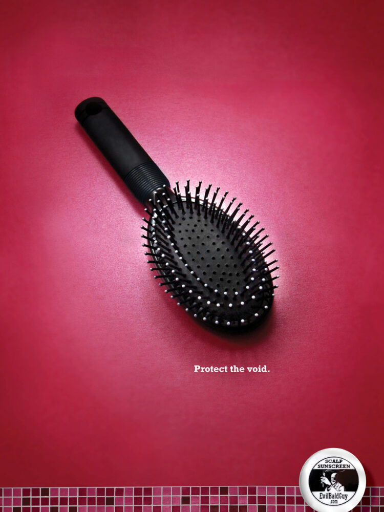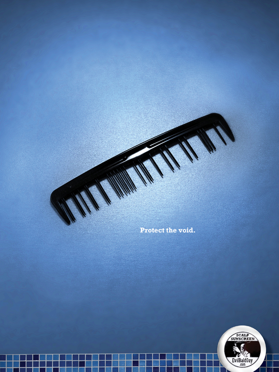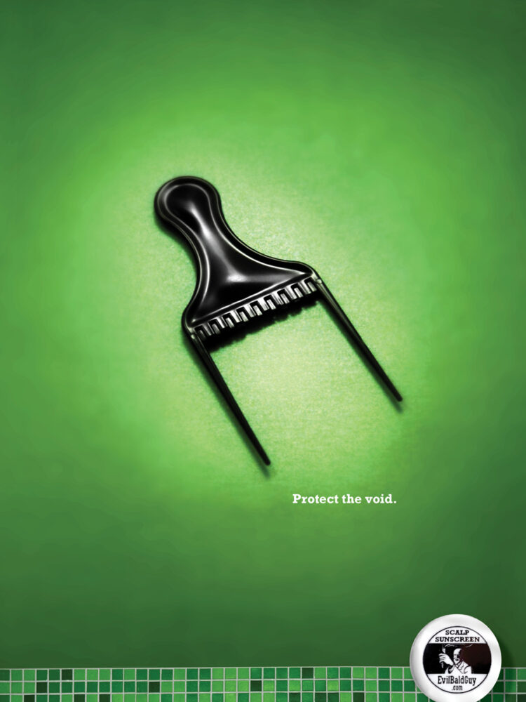 Evil Bald Guy, an upstart that makes sunscreen for the scalp, wanted to punch up its communications for summer. Bald art director Brad Roberts and thin-haired copywriter Paul Singer, a Seattle-based freelance team, heeded the call. First on the to-do list? Point-of-purchase posters. Giving the company the most bang for their buck, the campaign consists of a visual premise and an anthem line, which can eventually be blown out across all media.