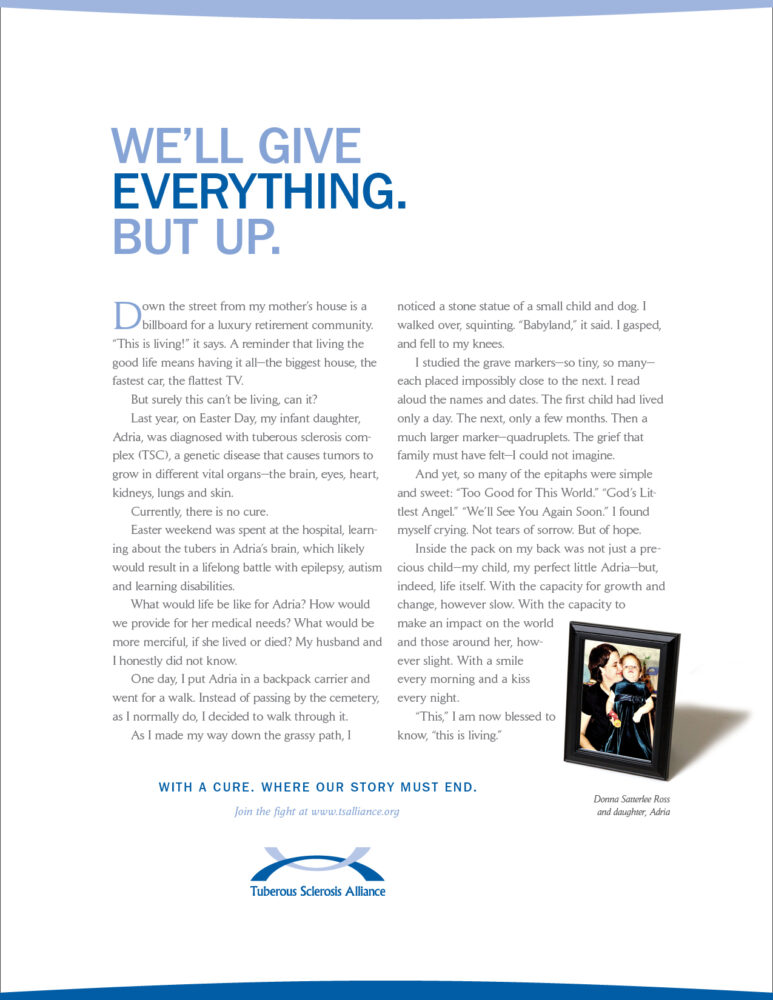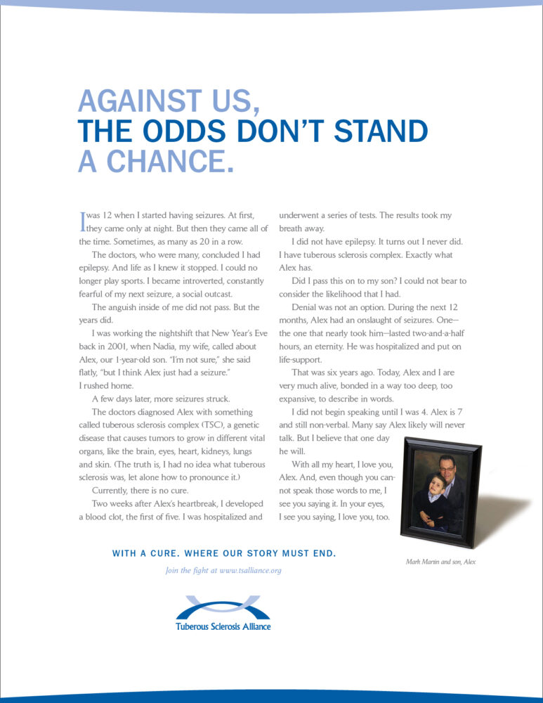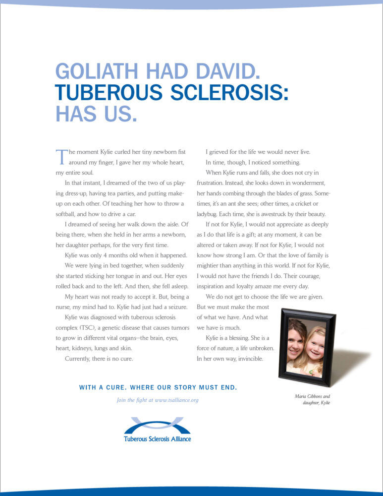 Tuberous sclerosis complex (TSC) is a rare genetic disease that causes non-malignant tumors to grow in the brain, and on the heart, kidneys, eyes, lungs and skin. The TS Alliance—a small but determined group of families, friends and medical professionals—fights not only to cure TSC, but also because a cure for TSC could lead to cures and new treatments for epilepsy, autism and cancer.